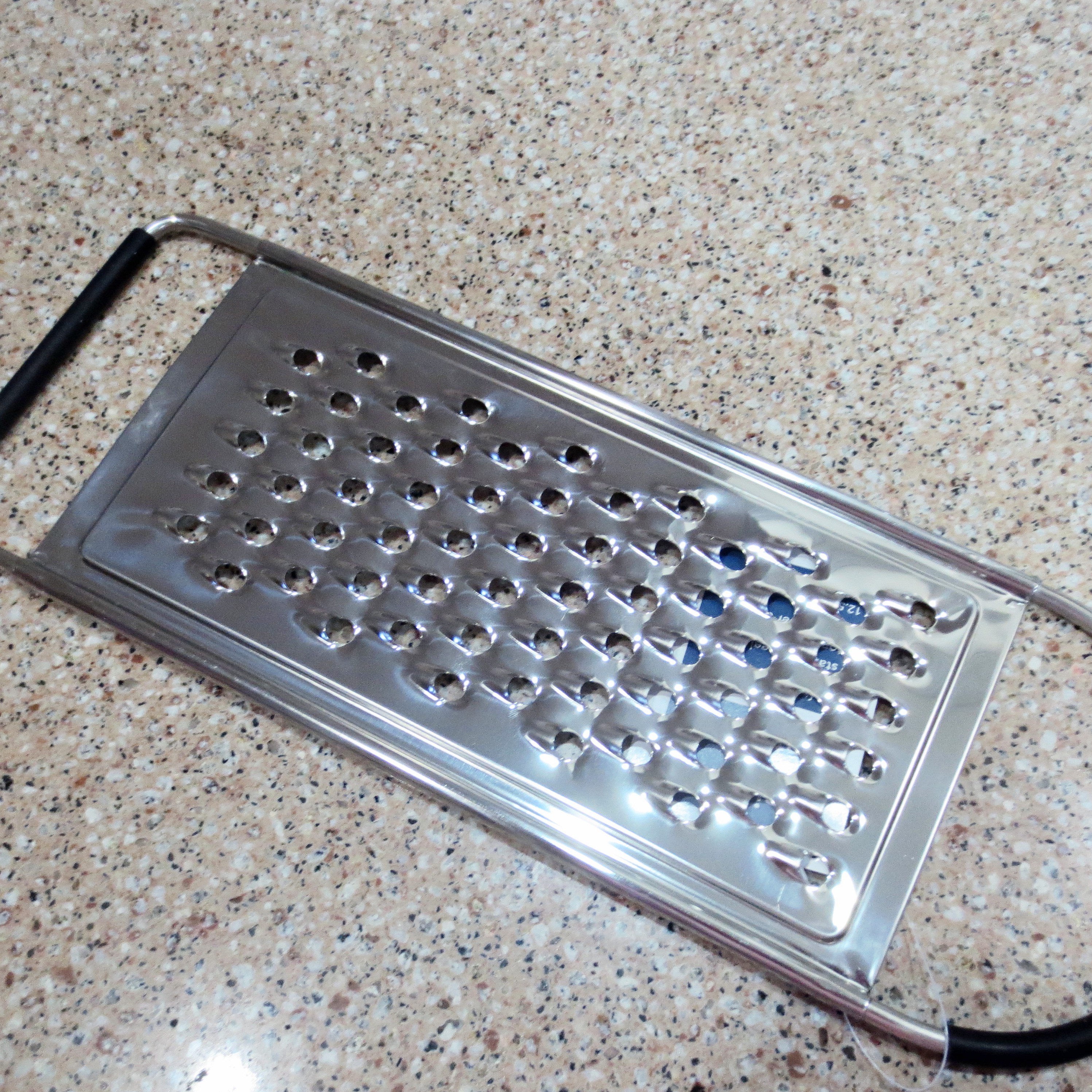 I finally found one! I have looked in just about every store in town trying to find a flat stainless steel grater. Most of the flat graters I found were framed in plastic and many were not stainless steel. Let me explain why those were not acceptable.