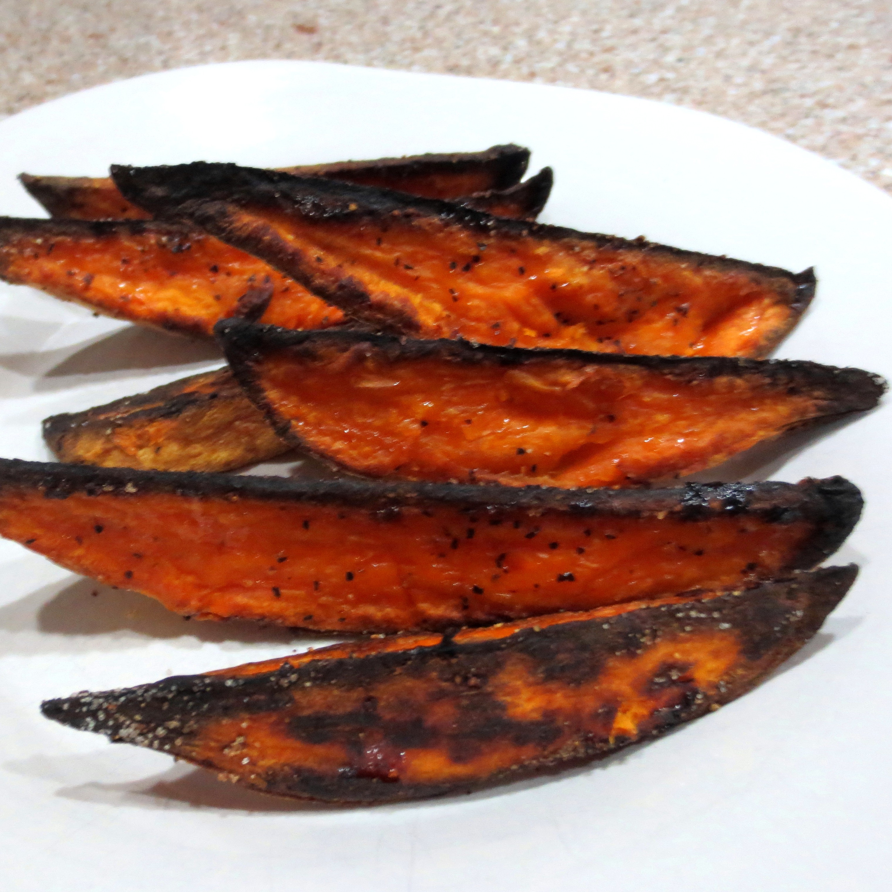 See what happens when you forget to set the timer? By the time I started to smell these Sweet Potato Oven Fries they were almost beyond redemption. We did cut off the burnt tips and nibble around on the rest, but they would have been so much more appealing and better tasting if I had just set that timer!