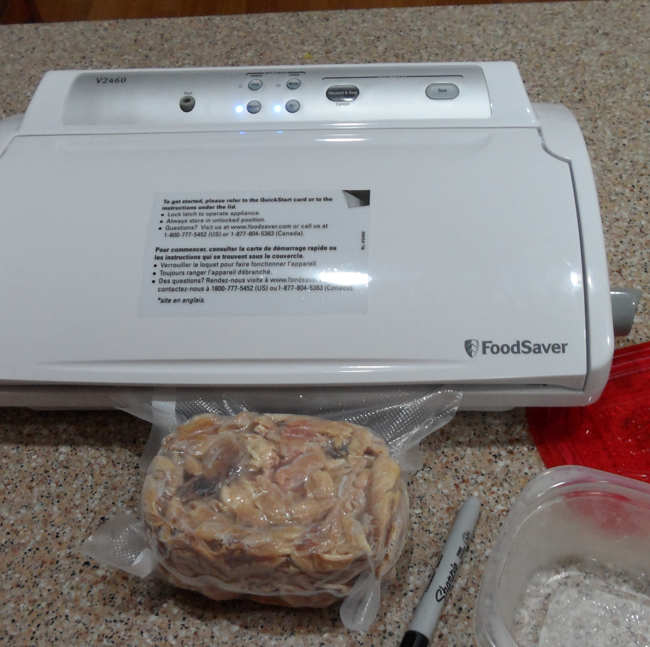 I love my Food Saver! It’s a vacuum sealing system that really does make foods last longer by removing air from the packaging. Almost everything that goes into my freezer is in Food Saver packaging. I freeze it first in a zip-lock type container or on a sheet tray before it goes into the Food Saver. That way all my packaged food stacks together nicely and I don’t have to buy multiple containers.