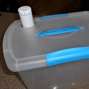 This particular model cost $179.00 and the stainless steel model would have been $199.00, but less expensive brands are available. Also, there is the issue of the water container. I first used a stock pot, which worked, but didn’t leave much room for the food. The manufacturers recommend a lidded plastic box with a hole for the cooker, but those cost around $30.00. I managed to solve the container issue with the help of a handy husband. I went to the dollar store and bought a $5.00 file box and had Michael dremmel out the required opening. It’s not pretty, but it works!