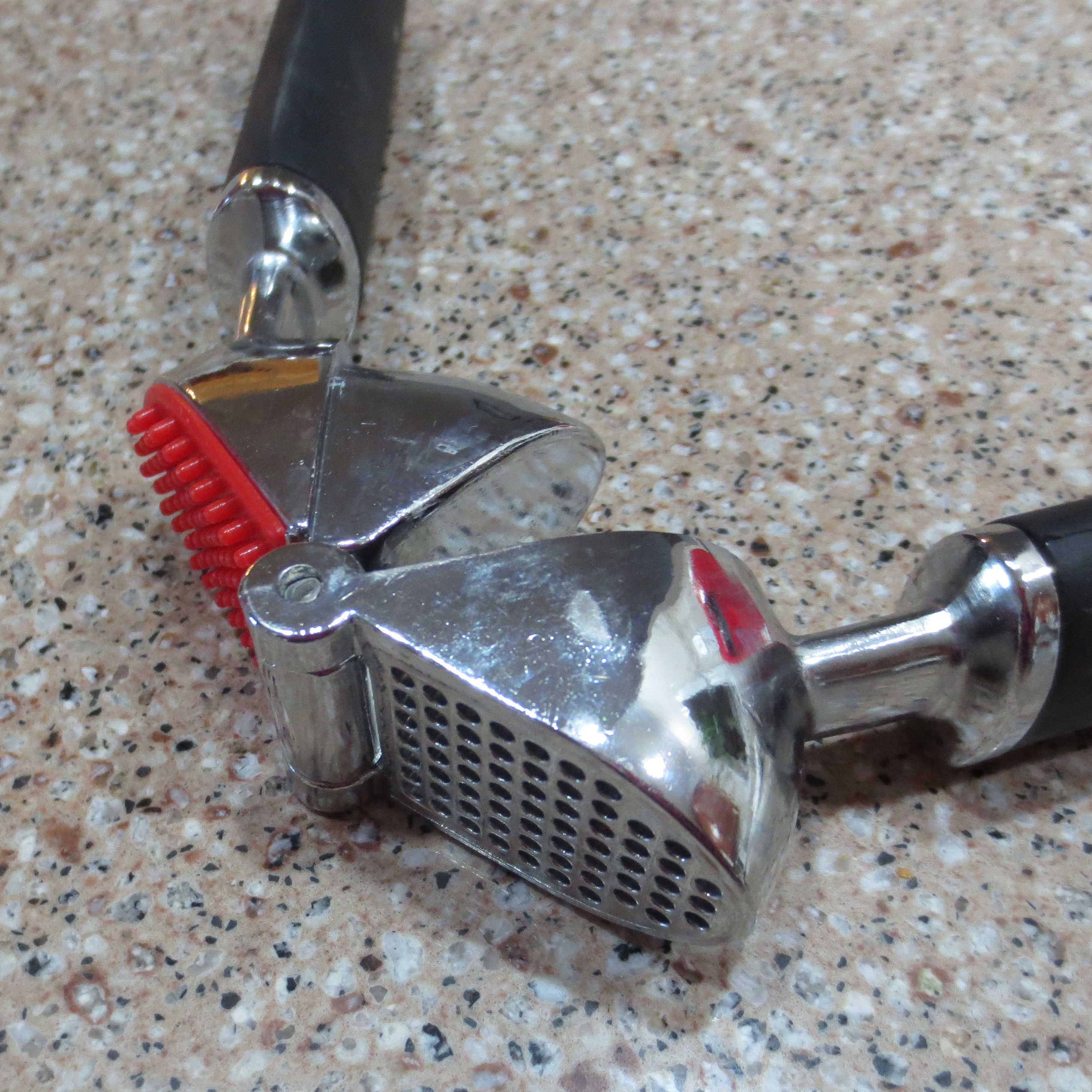 A garlic press makes quick work of turning a clove of garlic into a paste. This one is double sided. You press the garlic out of the press with the flat side, then clean it by turning the pronged side through the holes of the press before washing. I often prefer using garlic paste rather than minced garlic when I want a more subtle garlic flavor.