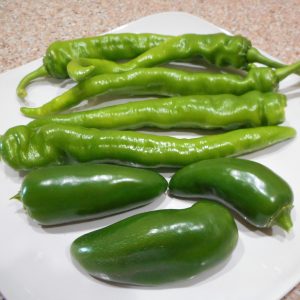 Generally speaking, the largest peppers, like bell peppers and poblanos, are the mildest. The smallest peppers, like habeneros and ghost peppers are the hottest. Also, pointy ends can be an indicator of heat. Don’t let the color fool you. Color has no relationship to heat. Red and orange bell peppers are very mild and sweet, wonderful eaten raw. Take a bite of a green chili or serrano pepper, and you may be sorry!