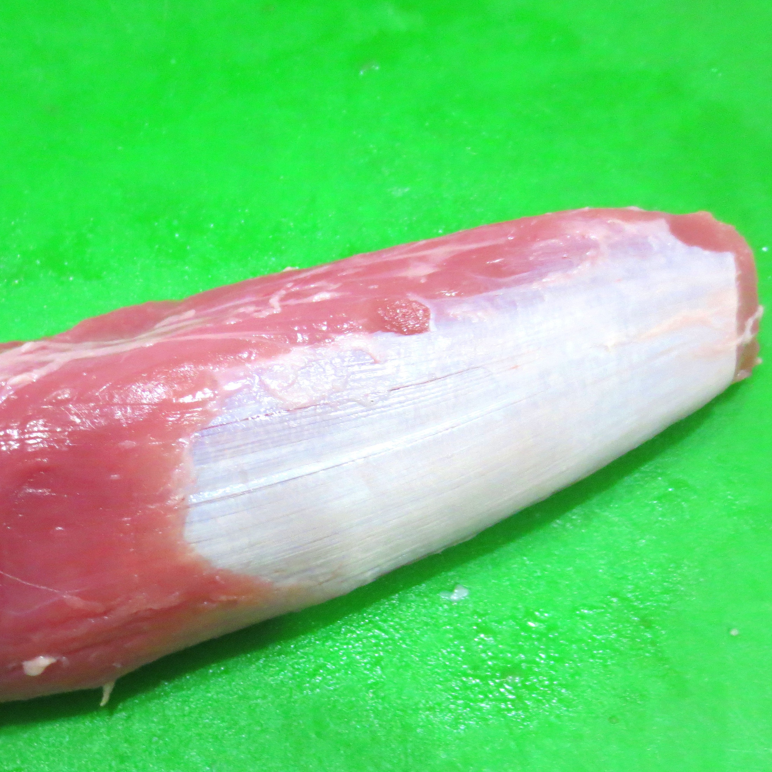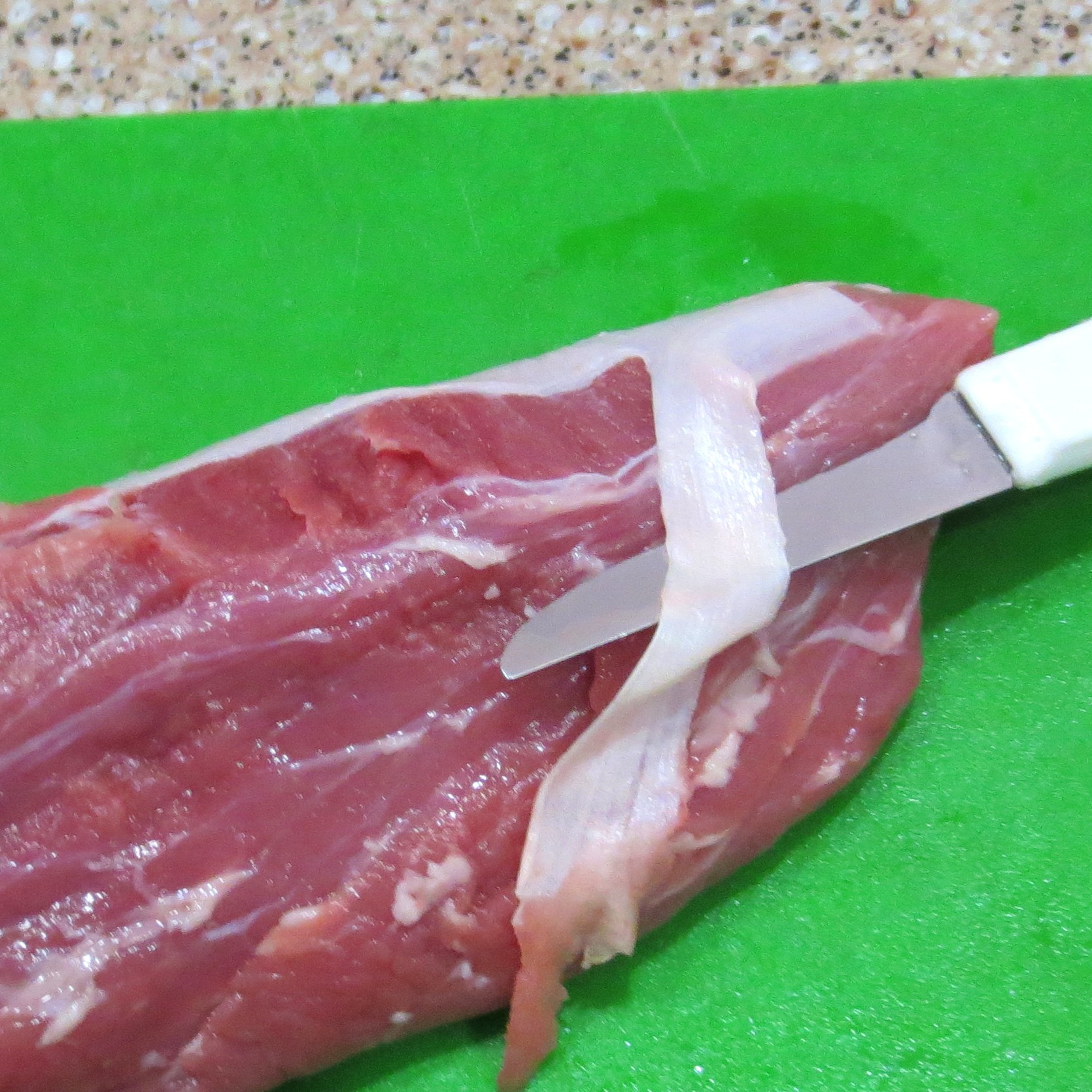 Next, trim off as much of the surface fat as you like. I take off as much as I can. Locate the tough shiny membrane called the “silver skin”. This membrane can be a little tricky to remove but it has to go. Starting at the end of the silver skin that leads toward the center of the meat, slip your knife under the membrane to begin your cut. Hold the blade of the knife on an upward angle to shave the silver skin away while taking as little meat as possible. You may have to remove the silver skin in strips.